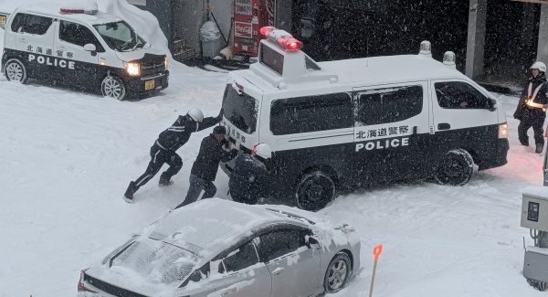 これは先週の画像ですが、事故処理か何かに来た車両がスタックして、皆さんで押していました。